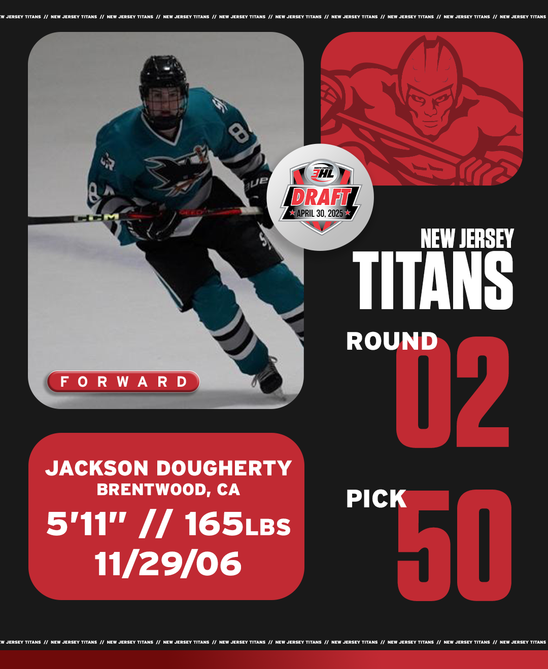 The New Jersey Titans are proud to announce the selection of Jackson Dougherty in the 2nd round, 50th overall, of the 2025 NA3HL Draft. A native of Brentwood, California, Dougherty played last season with the San Jose Jr. Sharks at the AAA level, where he recorded 31 points in 55 games across all competitions. He also starred at the high school level in his home Golden State, with 8 goals and 8 assists in 7 games for Oakland.